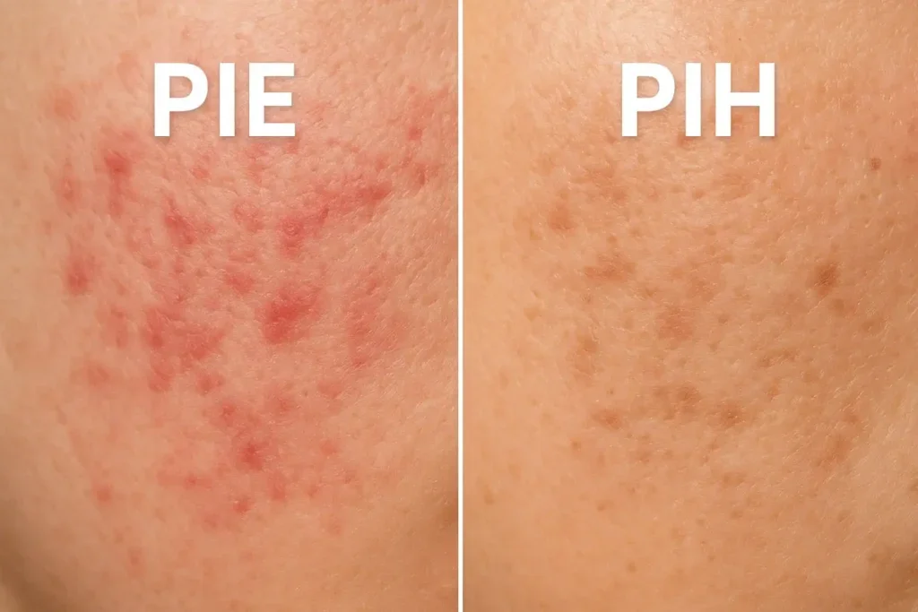 PIH typically appears on darker skin tones after an inflammatory skin condition, such as acne, eczema, or injury. On lighter skin, the same inflammation often leaves reddish or pink marks known as Post-Inflammatory Erythema (PIE).